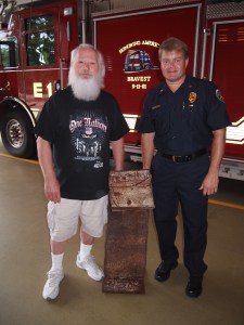 Daniel Hanson and Coon Rapids Fire Captain Ken Boelter standing next to a section of I-beam from the World Trade Center